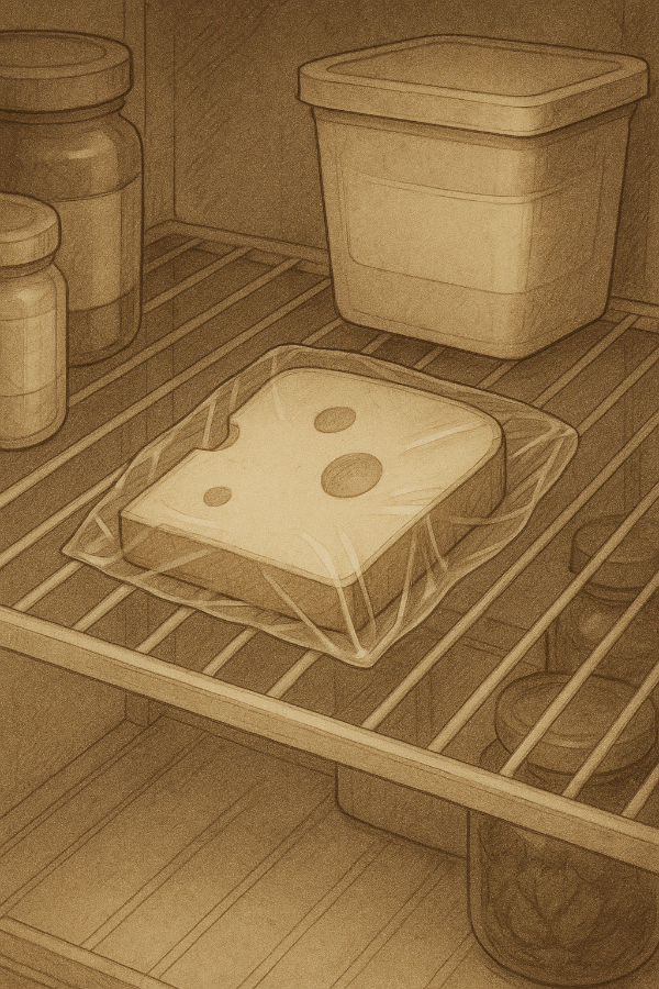냉장고 안, 투명한 랩 아래 놓인 치즈처럼